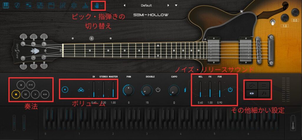 また、メインパネルの話ではないですが、音色を大きく変えるという点でライブラリの切り替えも重要です。右上の手のマークからピックと指弾きを切り替えることができます。指弾きの方がより温かみがある感じです。