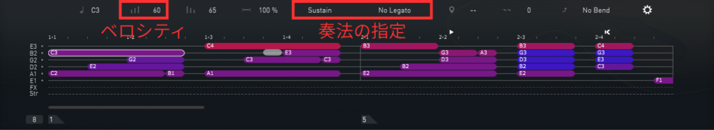 一番左で奏法を切り替えられます。各奏法にはキースイッチが用意されていますが、後に紹介するようにこれらのキースイッチを意識しなくても各奏法を駆使して打ち込むことが可能です。