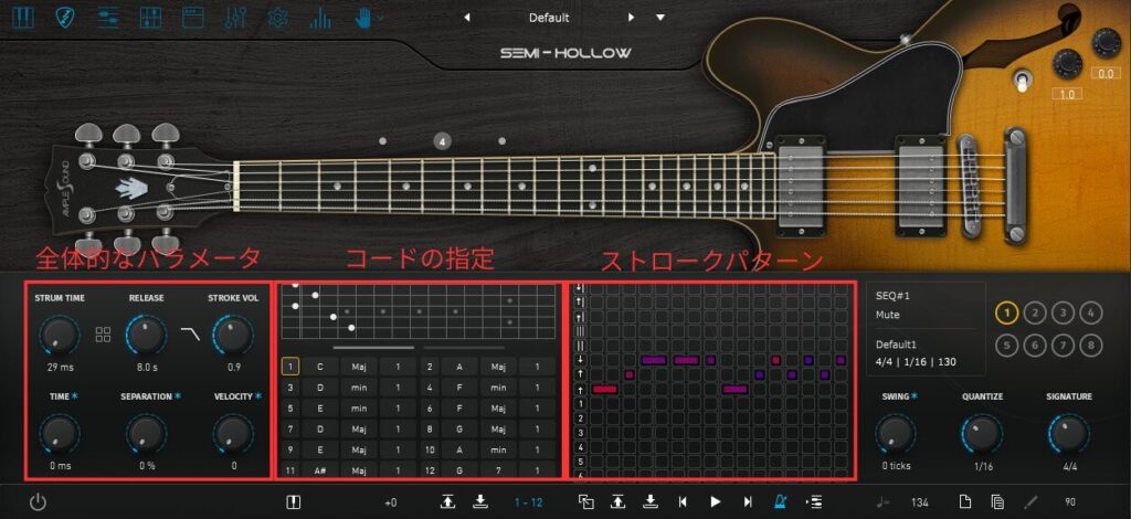 まず左の部分で、ストロークタイムやボリュームなど全体的なパラメータを調節することができます。ここについてはあまり詳しくは解説しません。曲やストロークパターンに応じて調節すると良いと思います。