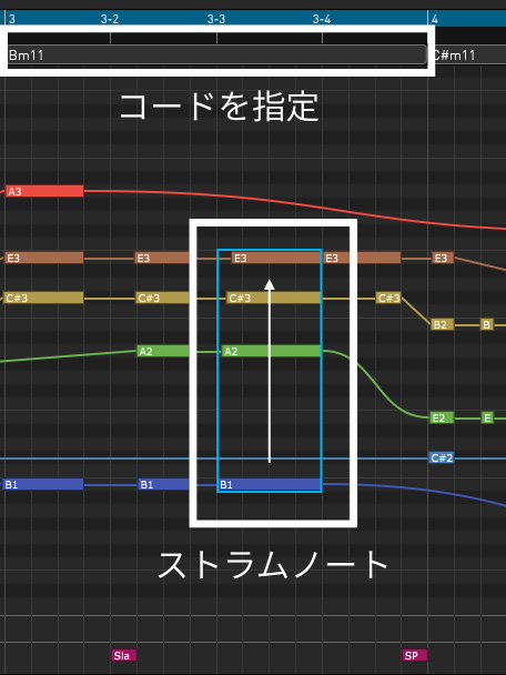 C1からB2のノートがスロットの各コードに対応するので貼り付けてからストロークの途中でコードチェンジする場合は1つのノートで指定することができます。ここはキースイッチっぽいことを意識する必要があるかもしれません。