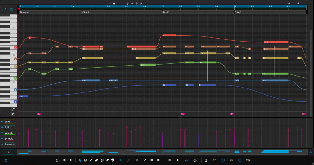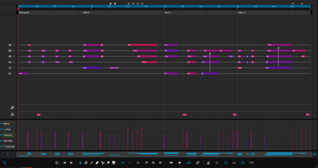 また、コードを弾きたいときは一番の下のStrレーンで、ノイズなどのパーカッシブな表現は下から二番目のFXレーンで打ち込めるのでRifferパネルだけで複雑なフレーズの打ち込みを完結させることができます。