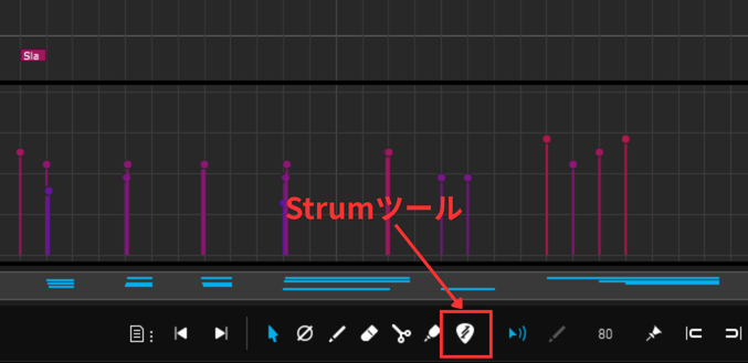 下の図のようにStrumツールを選択するとストラムノートというコード全体が一体となったノートを打ち込むことができます。